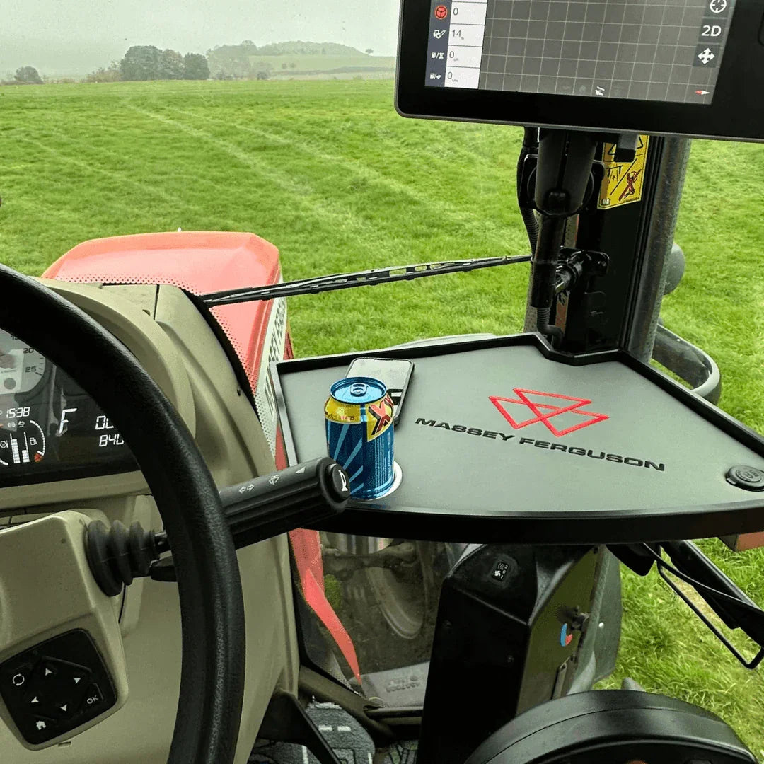 An exclusive, hand-built tractor cab table, designed to fit on the right A-pillar of your tractor, providing extra storage space and practical features to make your daily life as a farmer easier.